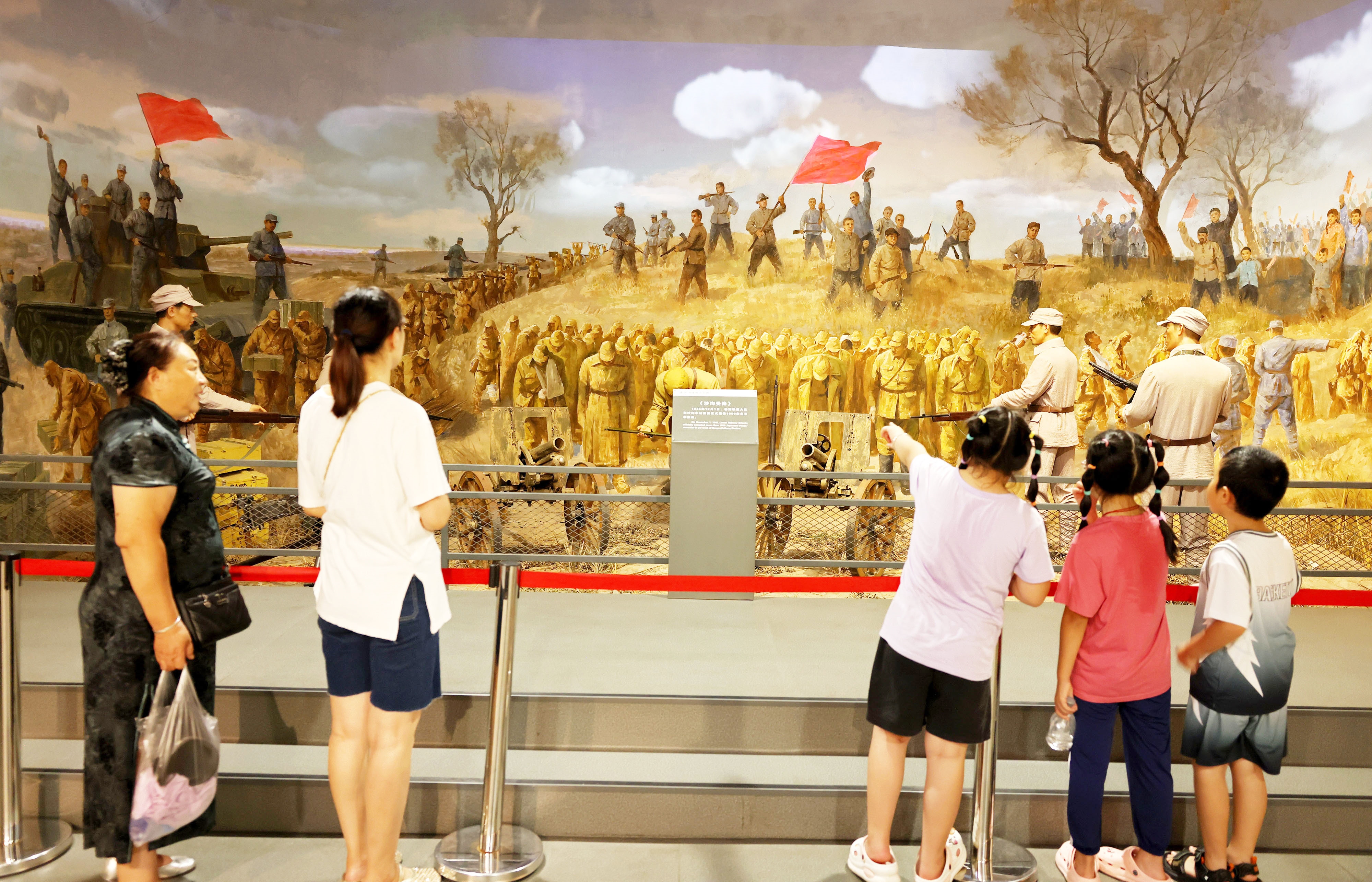 8月17日,人们在枣庄铁道游击队纪念馆参观。今年是中国人民抗日战争暨世界反法西斯战争胜利80周年,暑期,参观者们走进枣庄铁道游击队纪念馆,通过翔实的史料了解抗战历史,缅怀先烈事迹,传承抗战精神。 (吉喆 摄)