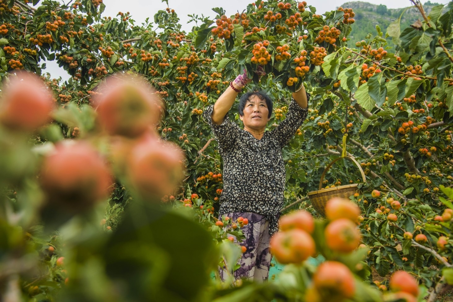 9月11日,山东省枣庄市山亭区水泉镇沟北村农民采摘山楂。