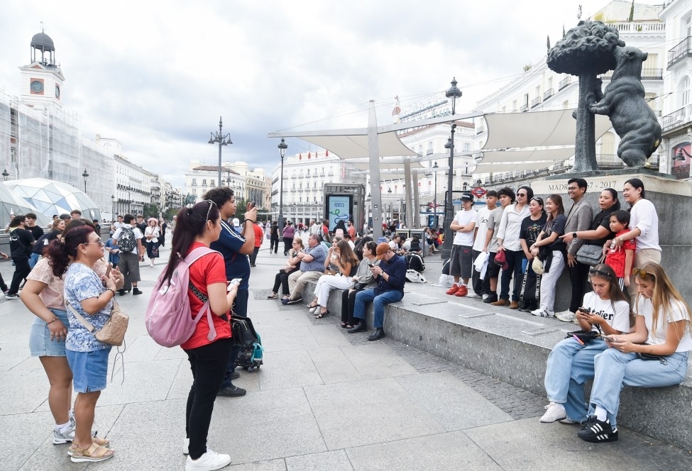 9月10日,游客在西班牙首都马德里街头合影留念。联合国世界旅游组织9日发布的最新《世界旅游业晴雨表》显示,2025年上半年全球国际游客到访量同比增长5%。