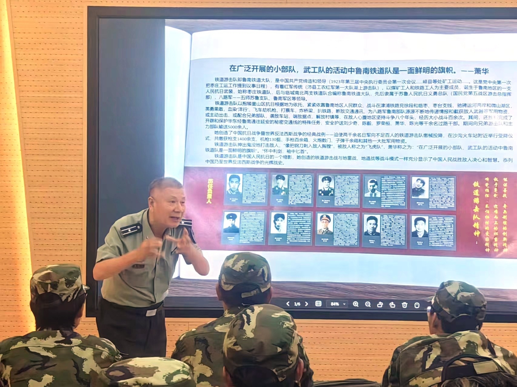 此次思政实践课,学生没有端坐于传统教室,而是走进了学院德廉馆。在鲁南铁道游击队事迹展牌前,大家驻足凝视,看着“夜袭洋行”“扒火车劫枪支”的黑白影像,仿佛穿越时空,回到了那段战火纷飞的岁月。活动还邀请枣庄铁道游击队展览馆馆长潘福安以日本军沙沟投降历史见证物“日本军刀”为切入点向学生讲述了80年前发生在枣庄沙沟火车站日本鬼子向鲁南铁道游击队投降的故事。