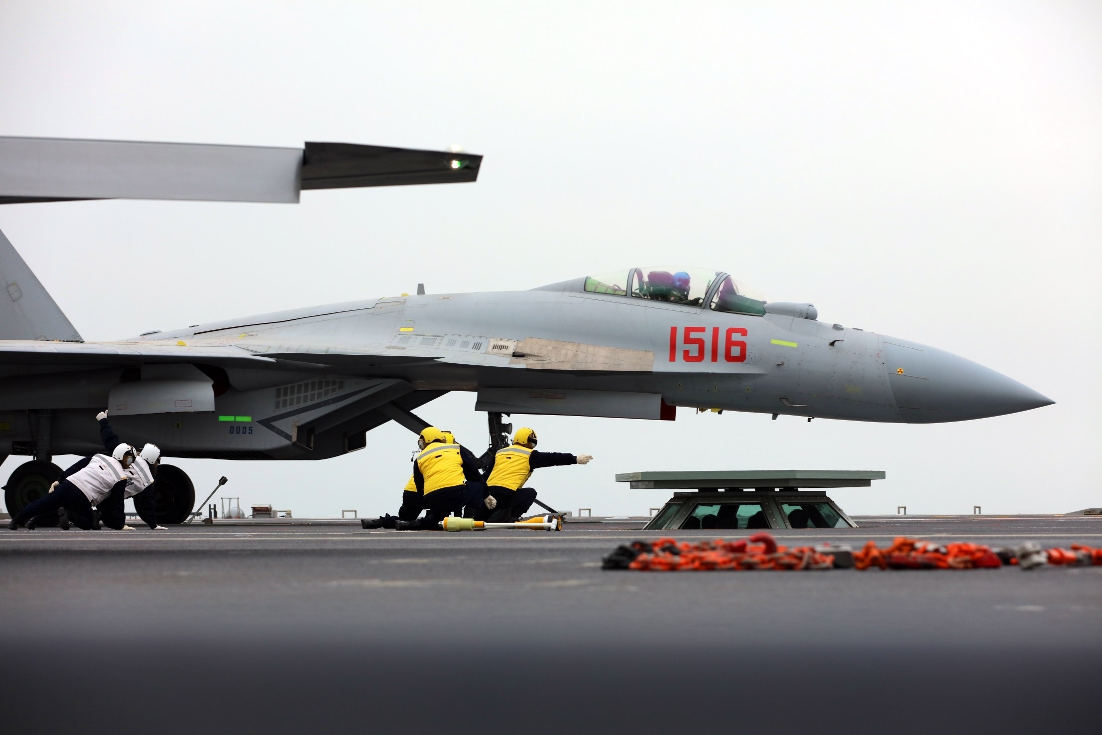 图为:歼-15T舰载战斗机在福建舰上电磁弹射起飞,起飞助理做出放飞手势(资料照片)。 新华社发(李唐 摄)