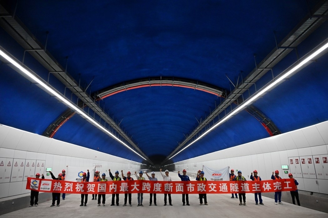 据介绍,该隧道全长1551米,双向双洞8车道,最大开挖跨度31.8米,最大开挖断面447.62平方米,是我国目前最大跨度断面市政交通隧道。 (新华社记者 李紫恒 摄)